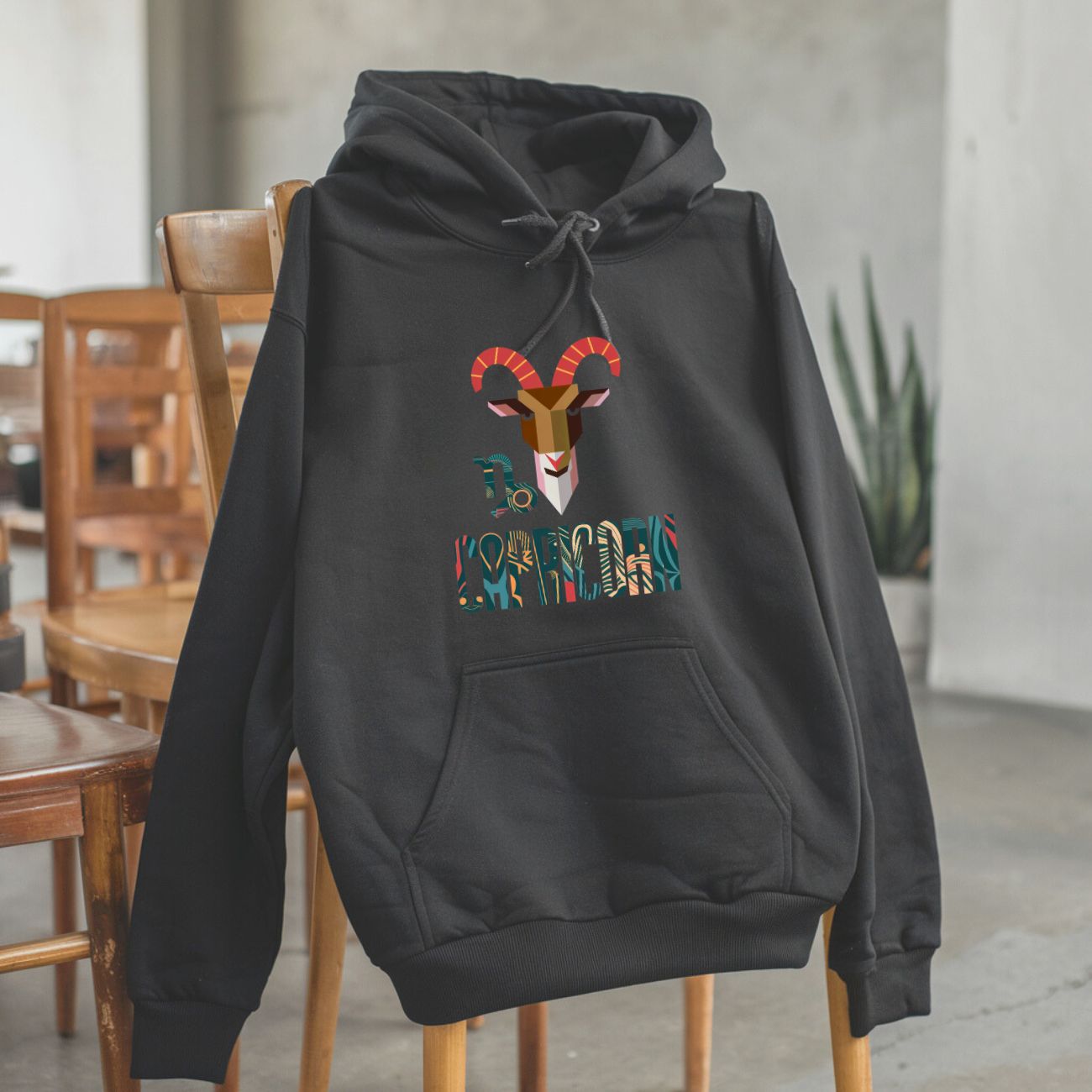 Bluza z kapturem z unikalnym nadrukiem inspirowanym znakiem zodiaku Koziorożca. Na przodzie znajduje się stylizowana grafika przedstawiająca głowę koziorożca w nowoczesnym, kolorowym designie, z napisami „Capricorn” oraz symbolem astrologicznym. Projekt przyciąga wzrok dzięki starannym detalom i żywej kolorystyce w odcieniach czerwieni, brązu i zieleni.
