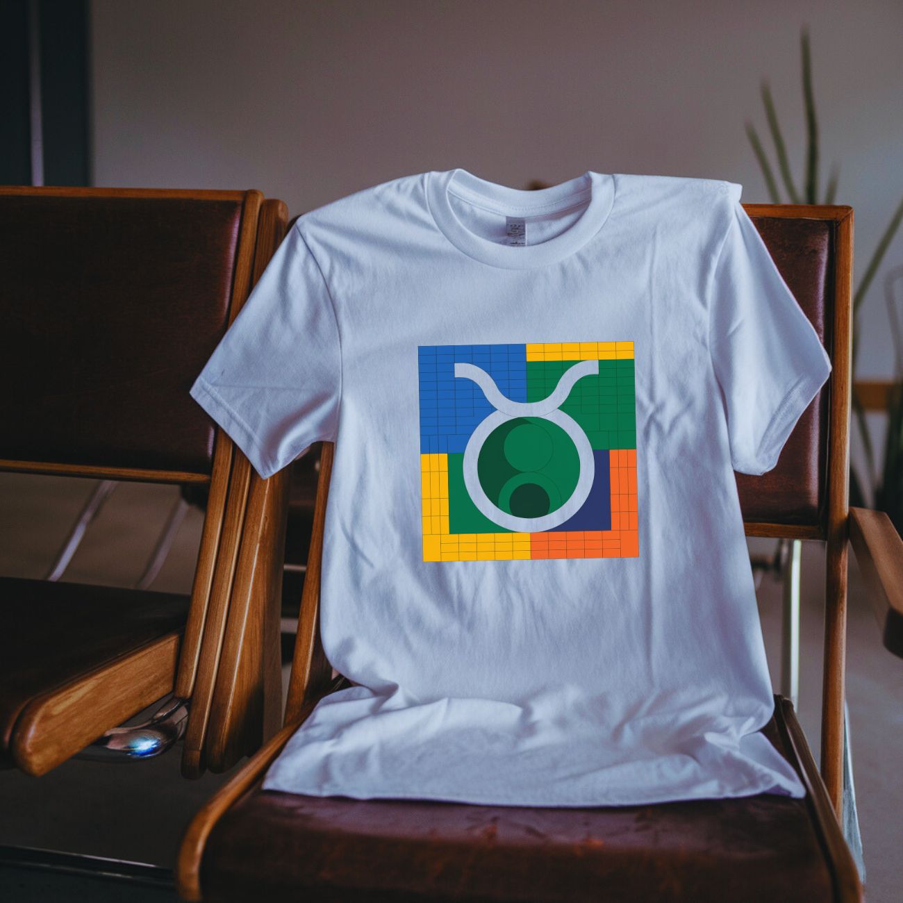 Koszulka unisex z wyjątkowym nadrukiem przedstawiającym symbol zodiakalnego Byka. Grafika została zaprojektowana w nowoczesnym, geometrycznym stylu z użyciem żywych kolorów, takich jak niebieski, zielony, żółty i pomarańczowy. Centralnym elementem nadruku jest symbol Byka umieszczony na tle barwnych prostokątów, co nadaje koszulce artystyczny i energetyczny charakter.