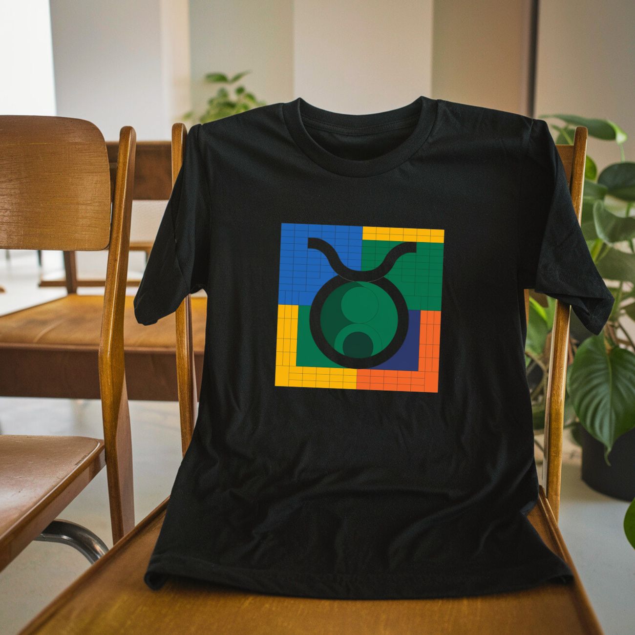 Koszulka unisex z wyjątkowym nadrukiem przedstawiającym symbol zodiakalnego Byka. Grafika została zaprojektowana w nowoczesnym, geometrycznym stylu z użyciem żywych kolorów, takich jak niebieski, zielony, żółty i pomarańczowy. Centralnym elementem nadruku jest symbol Byka umieszczony na tle barwnych prostokątów, co nadaje koszulce artystyczny i energetyczny charakter.